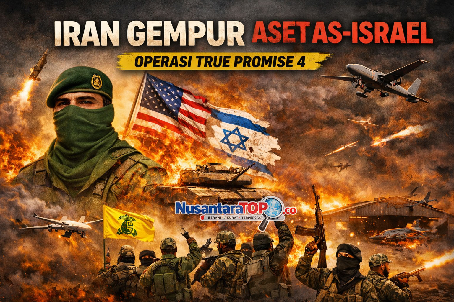Keterangan Foto: Ilustrasi digital menunjukkan eskalasi konflik di Timur Tengah, di mana Iran dan kelompok sekutunya melancarkan serangan terhadap aset militer Amerika Serikat dan Israel dalam operasi bertajuk “True Promise 4”, dengan latar ledakan, rudal, dan pertempuran bersenjata. (Foto: Ilustrasi/NusantaraTop.co)