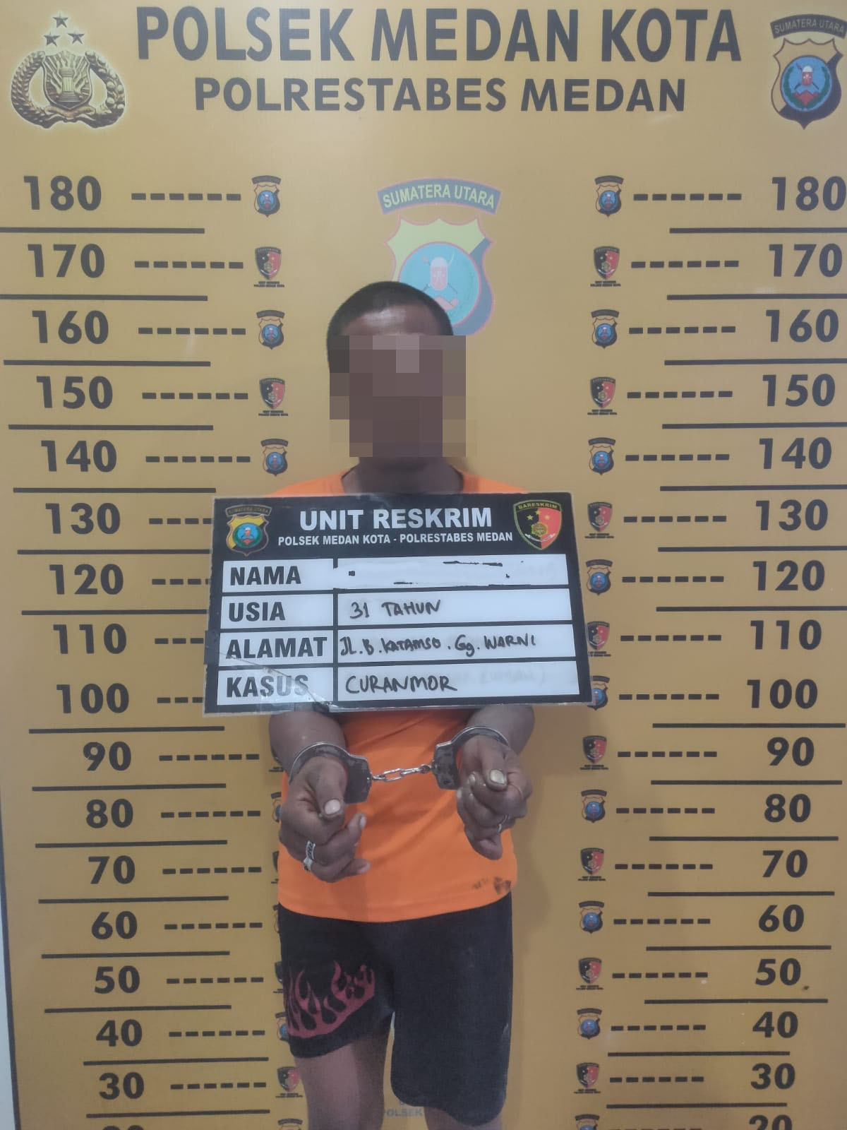 Pelaku diketahui bernama Muhammad Fauzan (31), warga Jalan Brigjen Katamso Gang Warni, Kelurahan Sukaraja, Kecamatan Medan Maimun. Ia ditangkap oleh Unit Reskrim Polsek Medan Kota pada Kamis (9/4/2026) dini hari sekitar pukul 02.00 WIB di kawasan Jalan Mangkubumi, Kelurahan Aur, Kecamatan Medan Maimun.